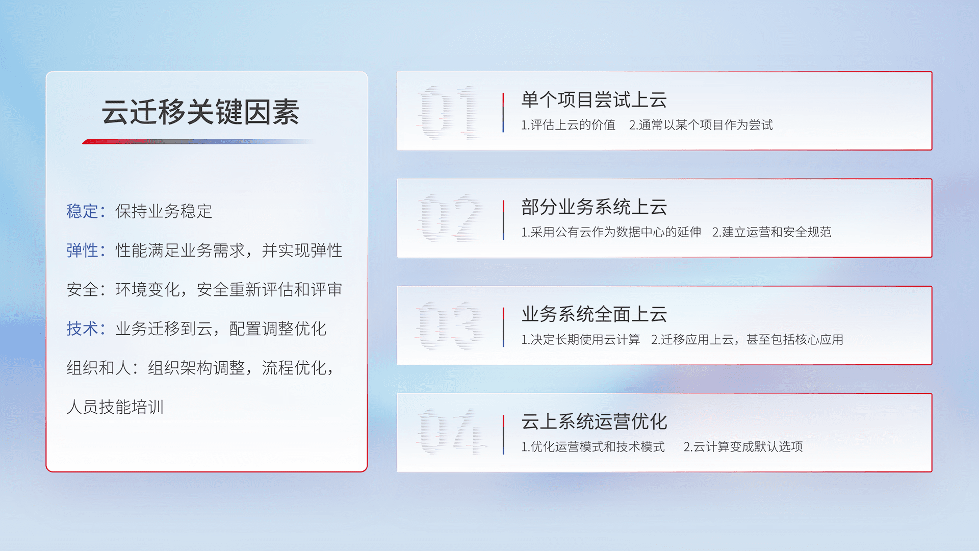 结合实际业务,,,,从规划设计、、、、云平台选型、、、、云原生改造、、数据迁移、、、、集成交付,,,,迁移全过程为客户识别最佳上云路径,,,做好风险识别管理,,,,设计网络架构、、、、身份权限、、安全审计合规、、、操作审计、、、日志审计、、、、监控告警策略、、、、多站点容灾设计等,,,对云上基础设施进行整体规划,,,,提升IT治理水平,,,,以满足弹性、、高可用、、、、高性能的需求。。