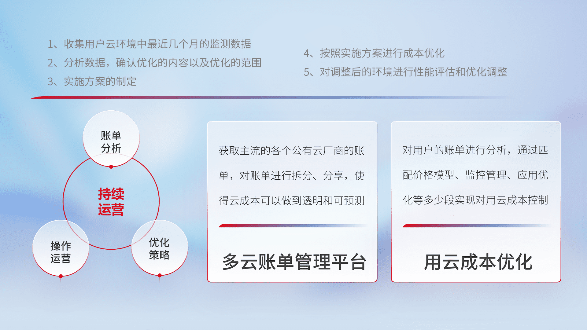 通过多云纳管,,以统一的资源数据模型把客户的云资源进行抽象和封装,,进而实现对多云资源的统一操作,,,,保障云资源管理的可靠性、、、、稳定性与可用性。。量身定制化运维内容,,,,配置、、、、开发运维、、补丁管理、、备份、、、监控、、、认证和访问管理、、、审计和日常巡检等,,,保障在用云过程中的可靠度,,稳定度以及高可用率。。