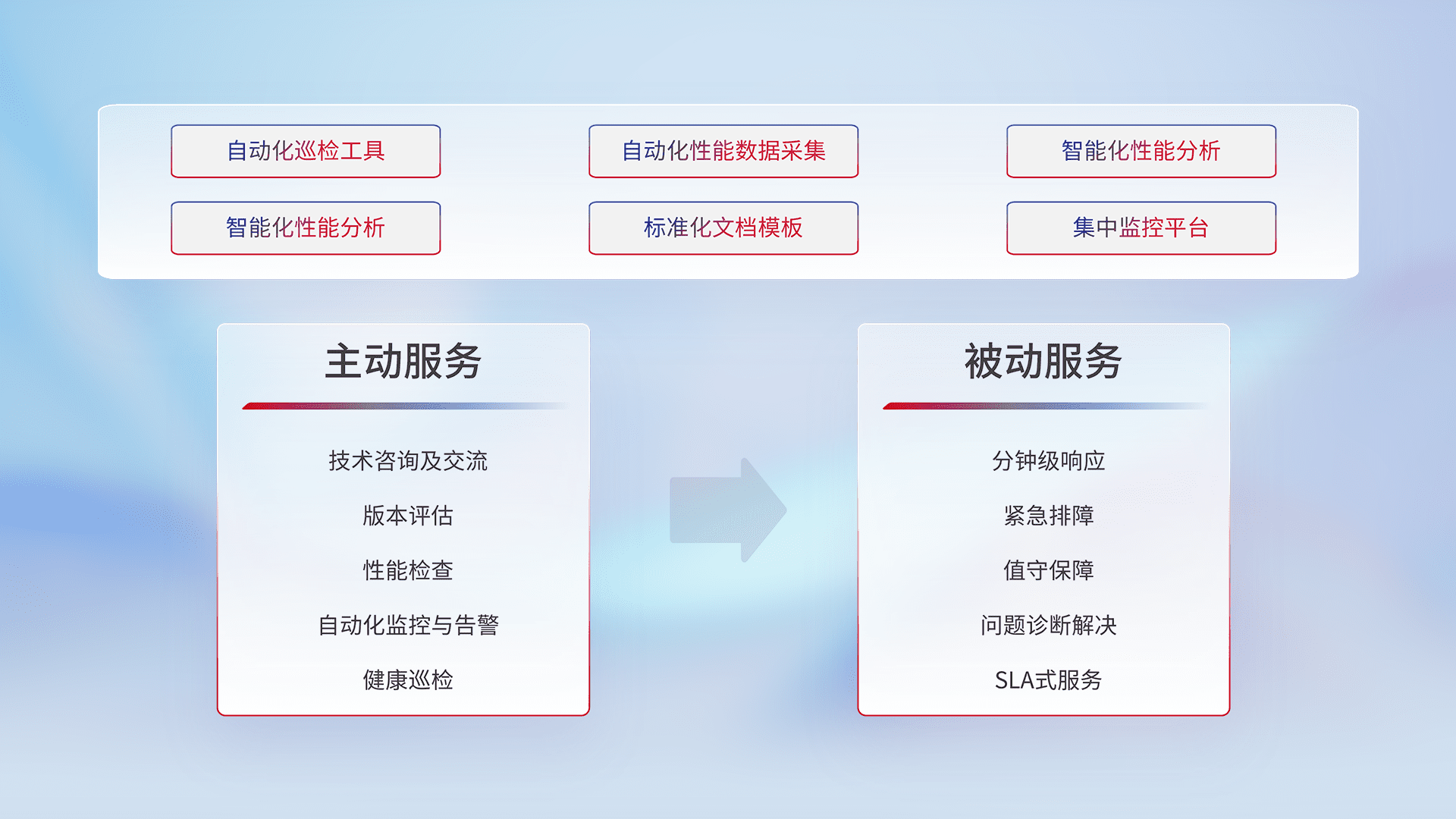 智能化工具和标准化文档,,保障服务质量,,,提供主动服务(包含技术咨询、、版本评估、、、、性能检查、、、、自动化监控与告警、、、健康巡检)和被动服务包含(分钟级响应、、紧急排障、、、值守保障、、、、问题诊断解决、、SLA服务)。。。